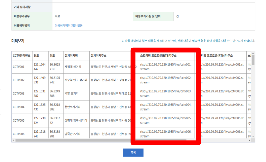 rtsp 주소는 공공데이터 포털에서 찾을 수 있습니다.