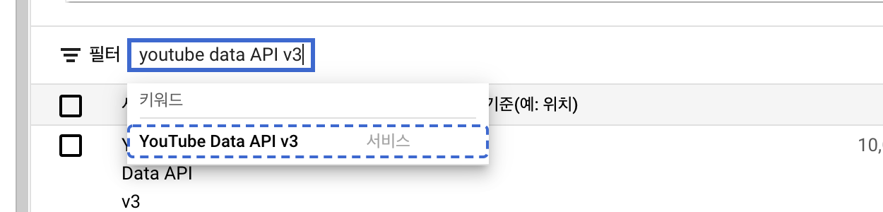 2. 필터 옆 검색 창에 "youtube data API v3" 입력