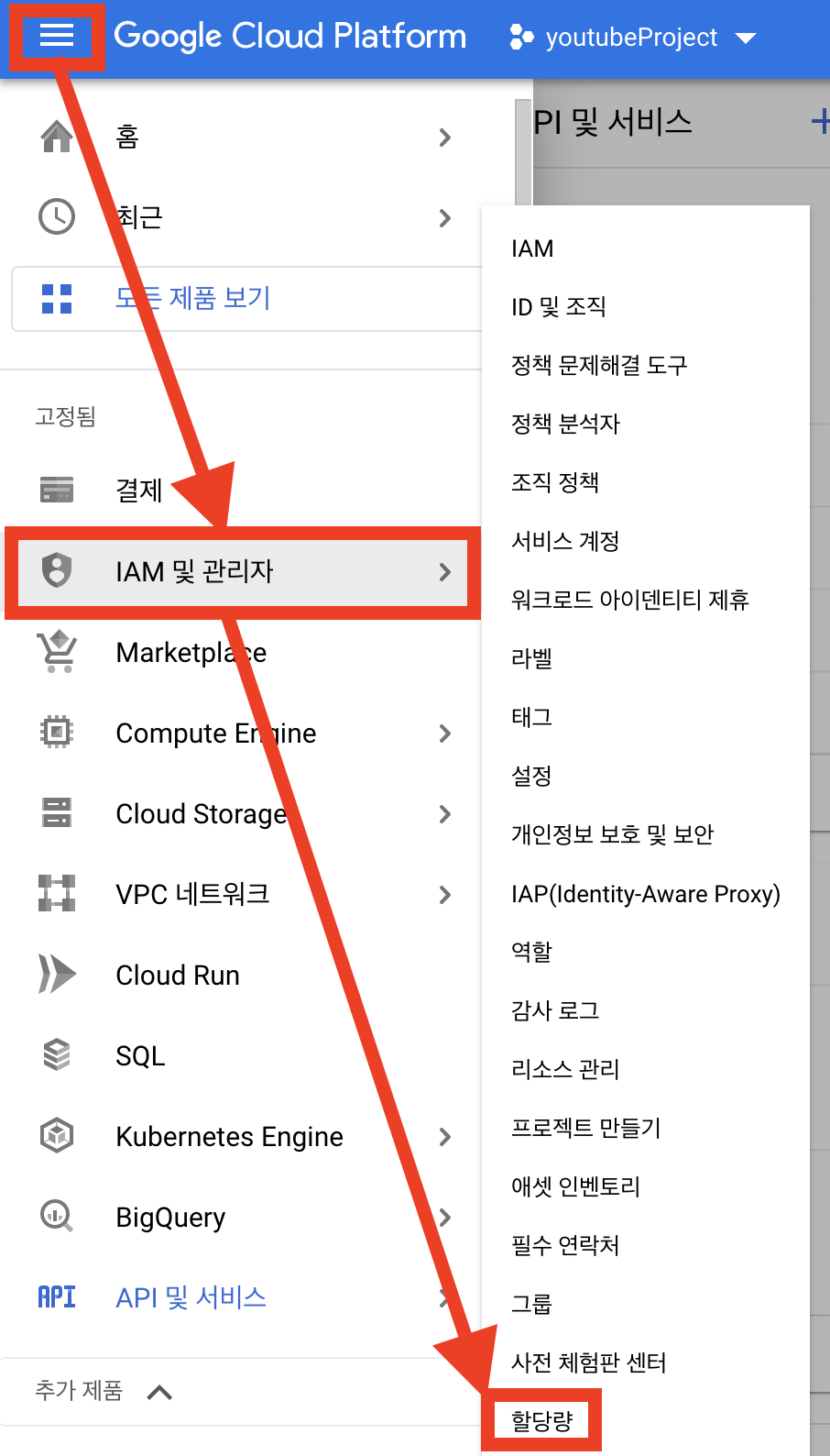 1. 메뉴 클릭 -> IAM 및 관리자 클릭 -> 할당량 클릭
