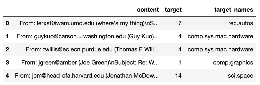 df = pd.read_json('https://raw.githubusercontent.com/selva86/datasets/master/newsgroups.json')