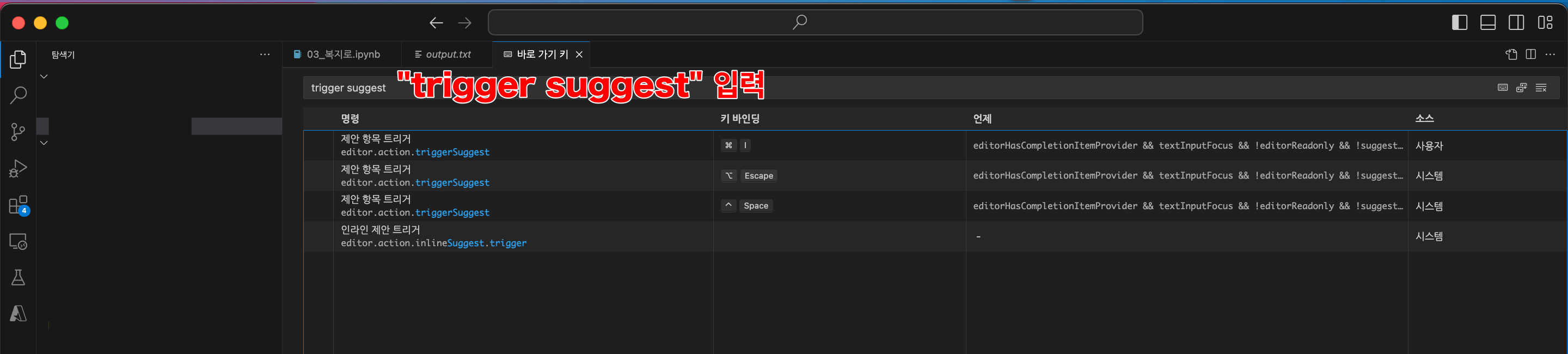 왼쪽 상단 입력칸에 "trigger suggest" 입력하였습니다.
