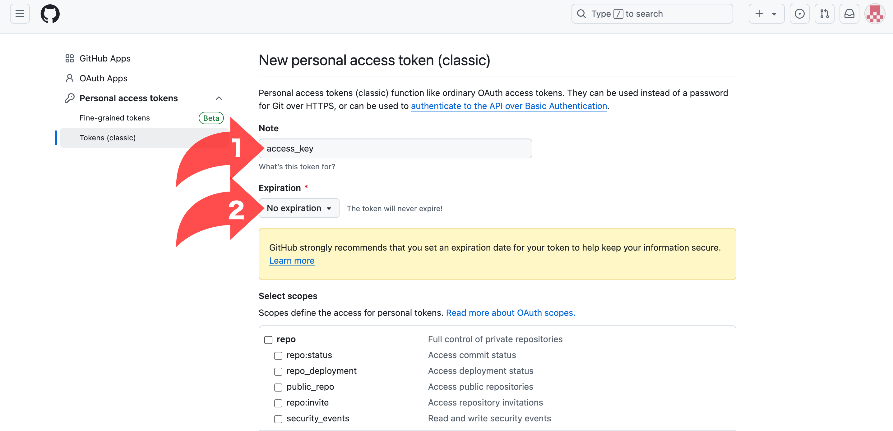 Expiration은 토큰 유통기한으로 원하는 기간을 선택하면 됩니다.(전 No expiration을 선택하여 기한을 두지 않았습니다.)