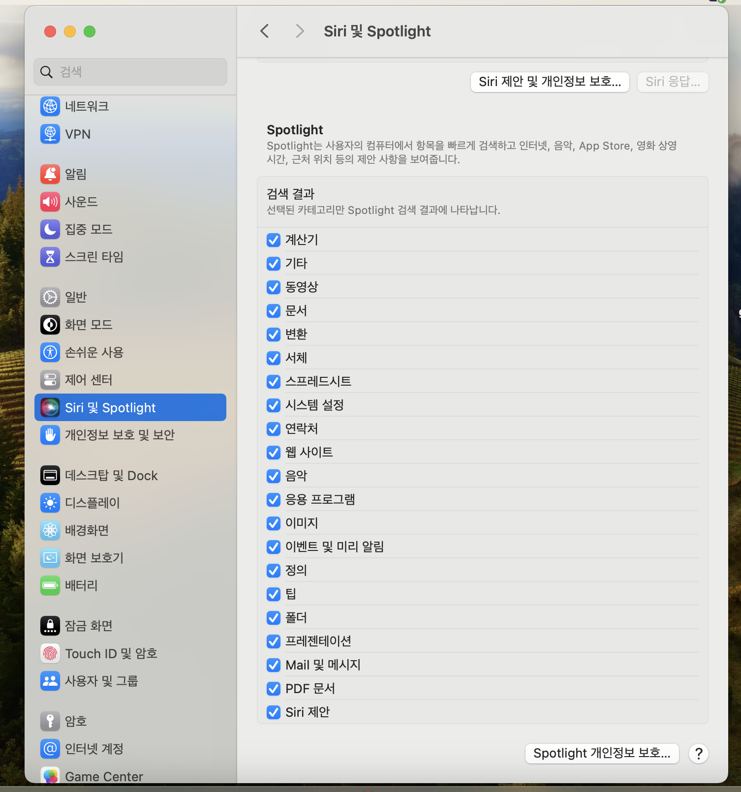 3. Spotlight 의 검색 대상을 아래 목록에서 확인할 수 있습니다.