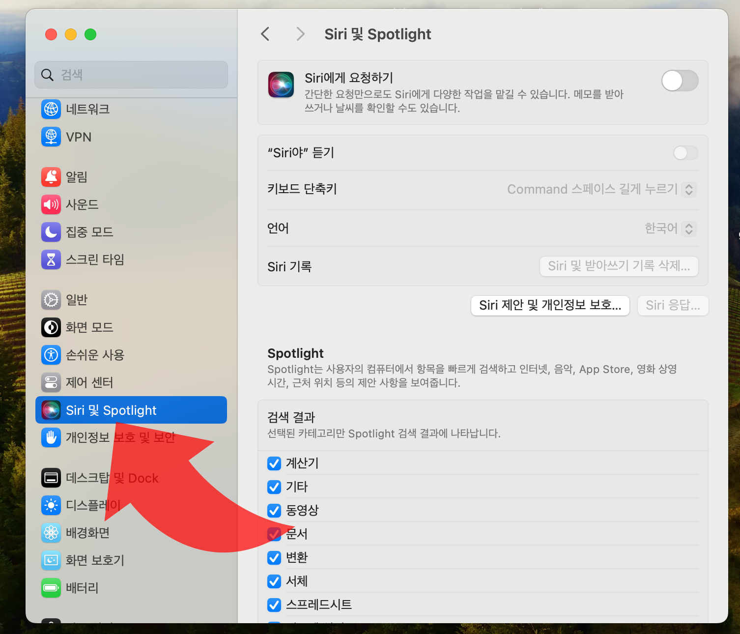 1. 시스템 설정 → Siri 및 Spotlight로 이동.