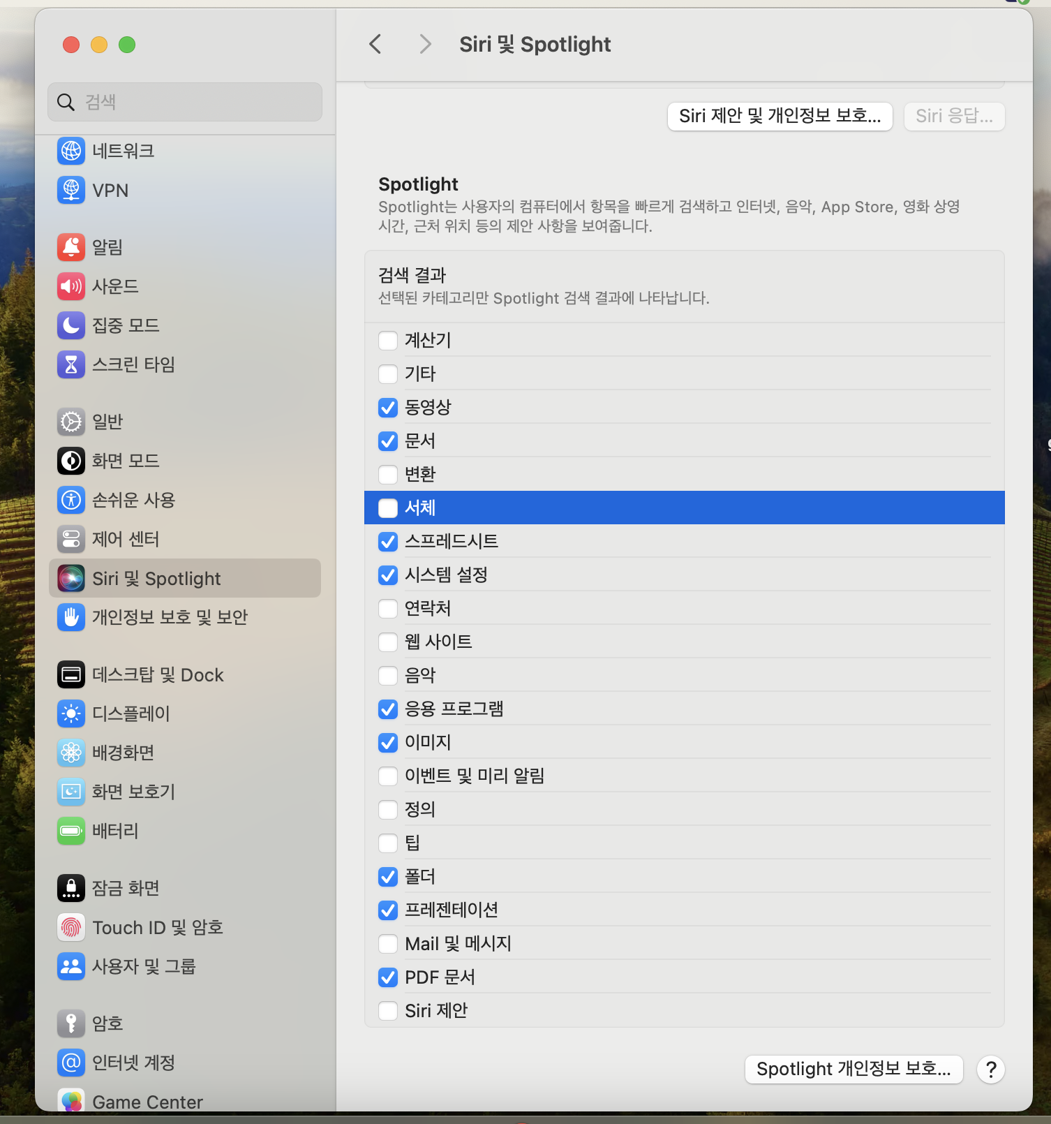 2. Spotlight 검색 대상 목록에서 불필요한 항목 제외.